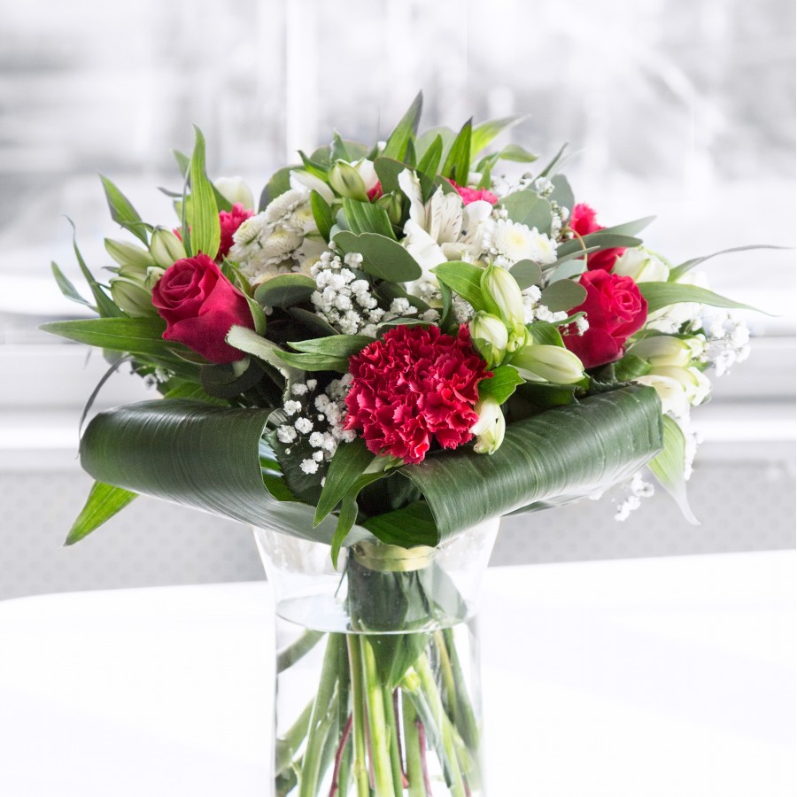 Experience the harmonious blend of colors with our Graceful Symphony Bouquet. This exquisite arrangement showcases the timeless beauty of red roses, the elegance of white chrysanthemums, and the softness of gypsophila, all beautifully arranged with white alstroemeria and aspidistra leaves.