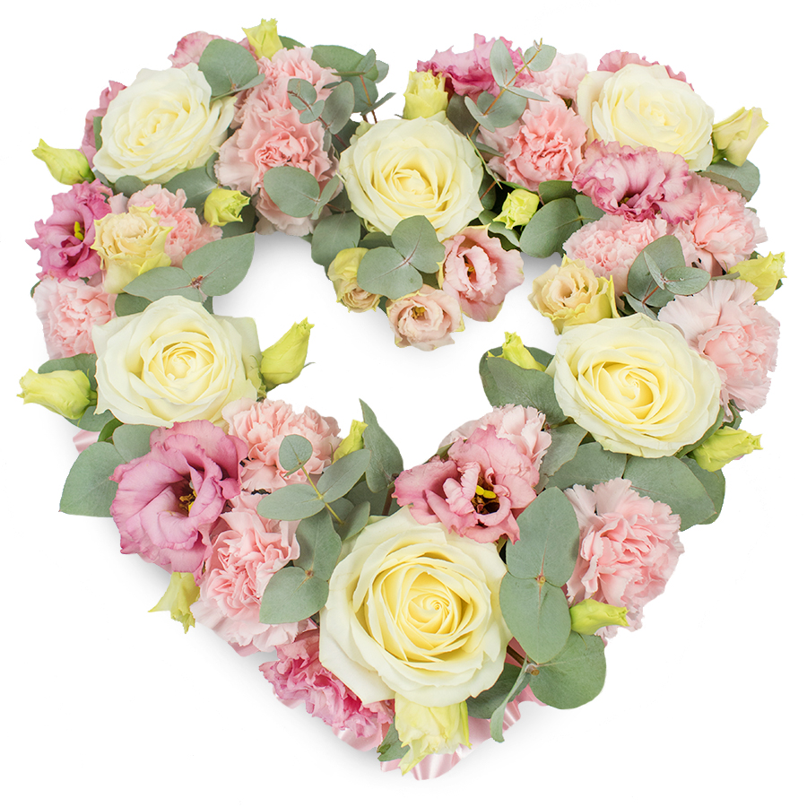 Experience the beauty and uniqueness of our meticulously crafted Open Heart Tribute bouquet. This stunning arrangement showcases a harmonious blend of elegant white roses, soft pink carnations, delicate pink lisianthus, and lush eucalyptus leaves.